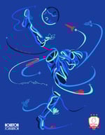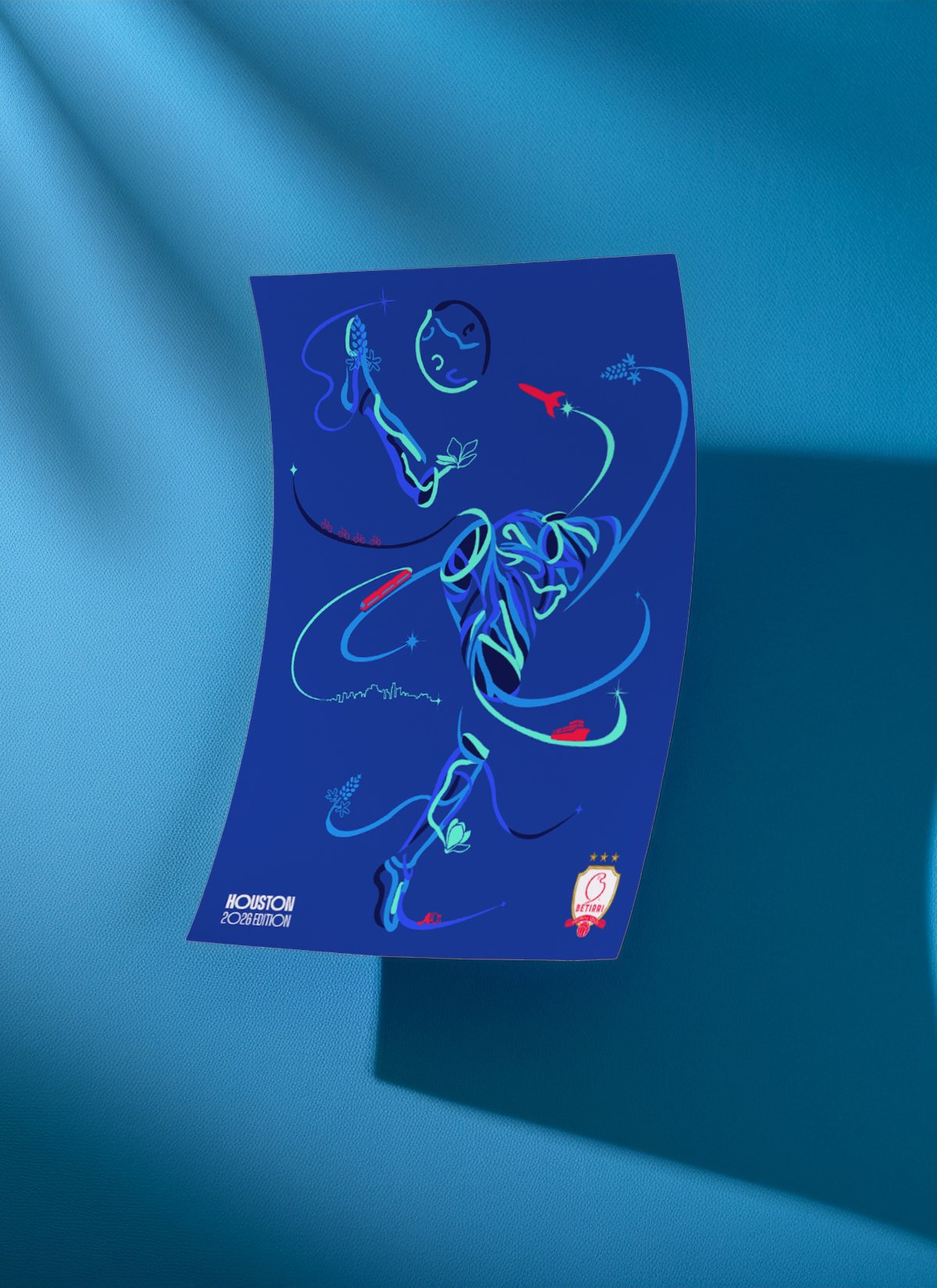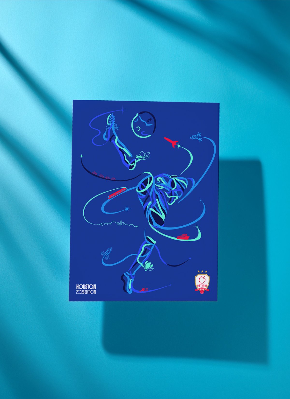 This piece celebrates Houston through the elements that move us — cargo ships, bicycles, rail, and the space shuttle — woven together with bluebonnets, magnolias, armadillos, and our skyline drawn in a continuous single line. Flowing ribbons connect it all, forming a footballer in motion, striking a ball that becomes the moon — a tribute to Space City and the global stage we’re about to step onto.